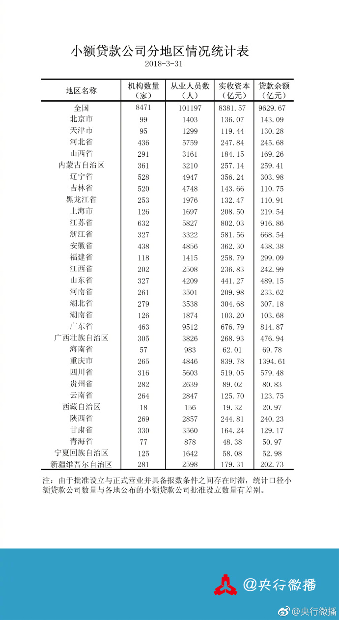 央行:3月末小额贷款公司8471家 贷款余额9630亿元